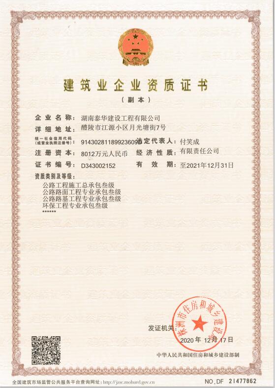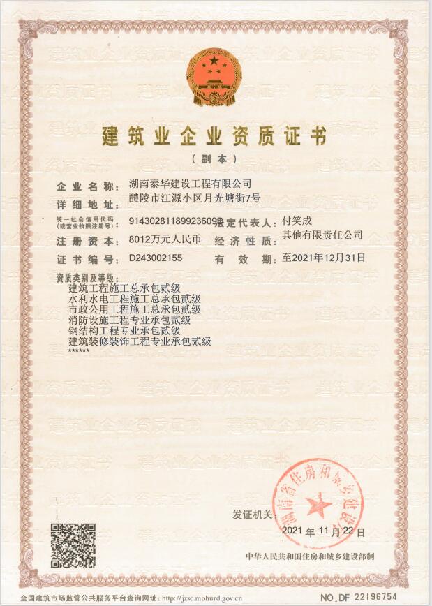 湖南泰華建設(shè)工程有限公司一家房屋建筑工程施工總承包貳級,水利水電工程施工總承包貳級,市政公用工程施工總承包貳級,鋼結(jié)構(gòu)工程施工專業(yè)承包二級,消防設(shè)施工程專業(yè)承包貳級,建筑裝修裝飾工程專業(yè)承包貳級;公路工程施工總承包叁級,鋼結(jié)構(gòu)、體育設(shè)施、環(huán)保工程、公路路面工程、公路路基工程專業(yè)承包叁級企業(yè)。…